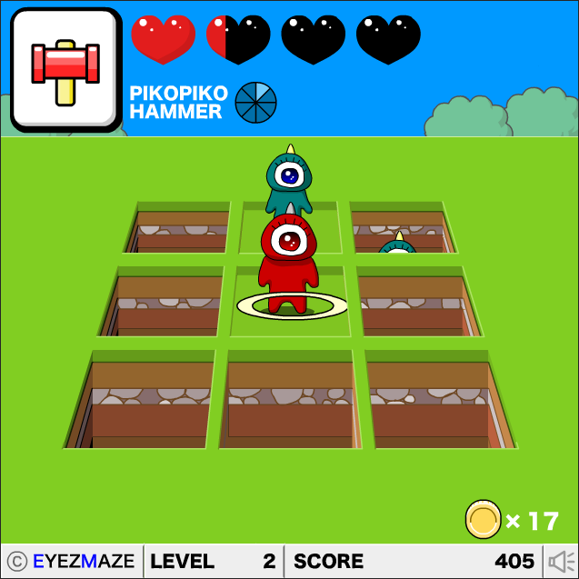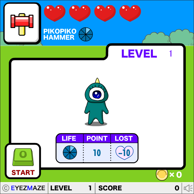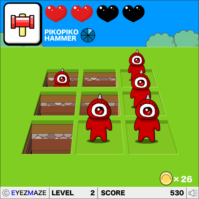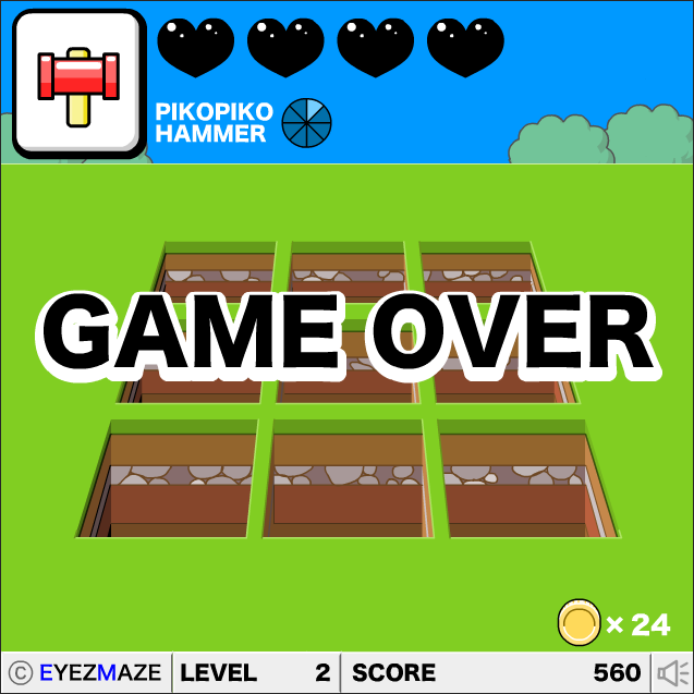 빈곳에 때리거나 잡지 못한 도깨비가 있다면 생명력이 조금씩 깍이며 모두 깍이면 게임오버가 됩니다.