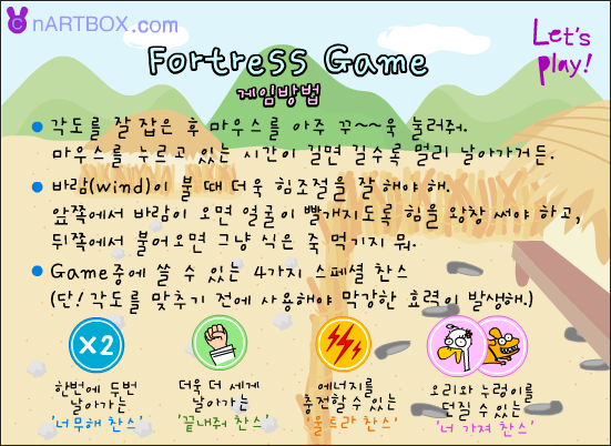 밍밍 vs 왕따는 게임시간이 짧으며 각도와 세기의 감각만 익히면 쉽게 플레이가 가능합니다.