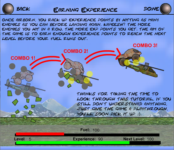 탱크가 폭탄을 맞으면 튕겨 올라가며 헬기를 공중에서 여러대 부수면 콤보가 적용되어 점수가 더 높아.. 뭐 이정도겠네요..