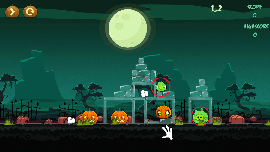 타겟은 호박과 녹색돼지가 보이는데 녹색돼지만 맞추면 클리어가 됩니다.