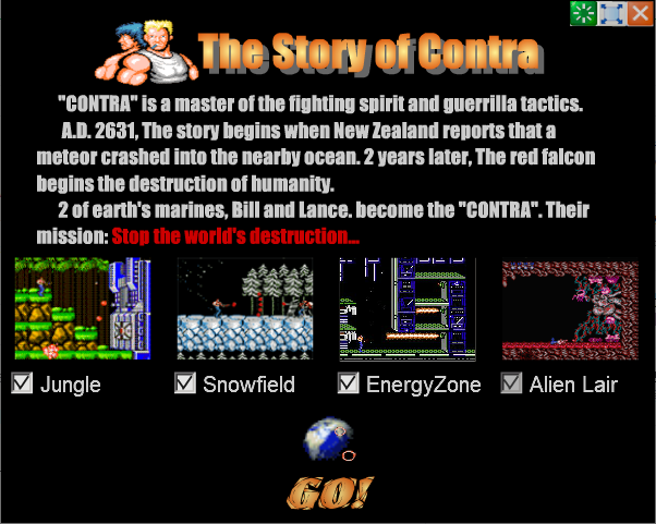 콘트라(Contra 25th Anniversary)는 플래시플레이어에서 즐길수 있습니다.