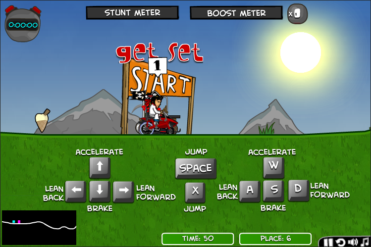 게임이 시작되면 "Get Set... Start!" 신호와 함께 레이스가 시작됩니다. 가속 키를 눌러 출발하고, 점프대에서 점프하며 공중에서 기울이기로 묘기를 선보입니다.