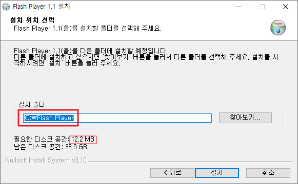 설치 폴더를 변경하지 않는 이유는 플래시플레이어 홈페이지에서 PLAY를 눌렀을때 플레이어와 연동을 하기 위해서입니다.