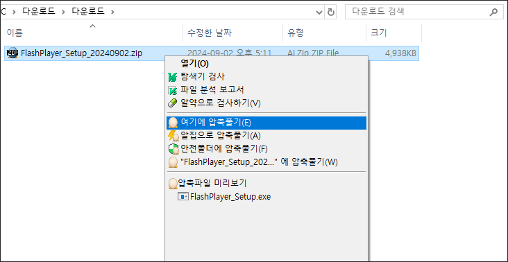 압축을 풀고 나면 FlashPlayer_Setup.exe파일을 실행하여 설치를 진행합니다.